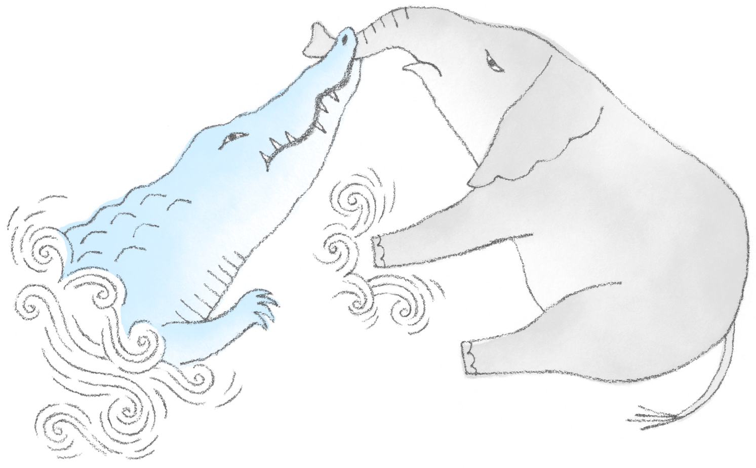子ゾウはふりほどこうと必死に頭をふりました。けれどもワニは口を離してはくれません。