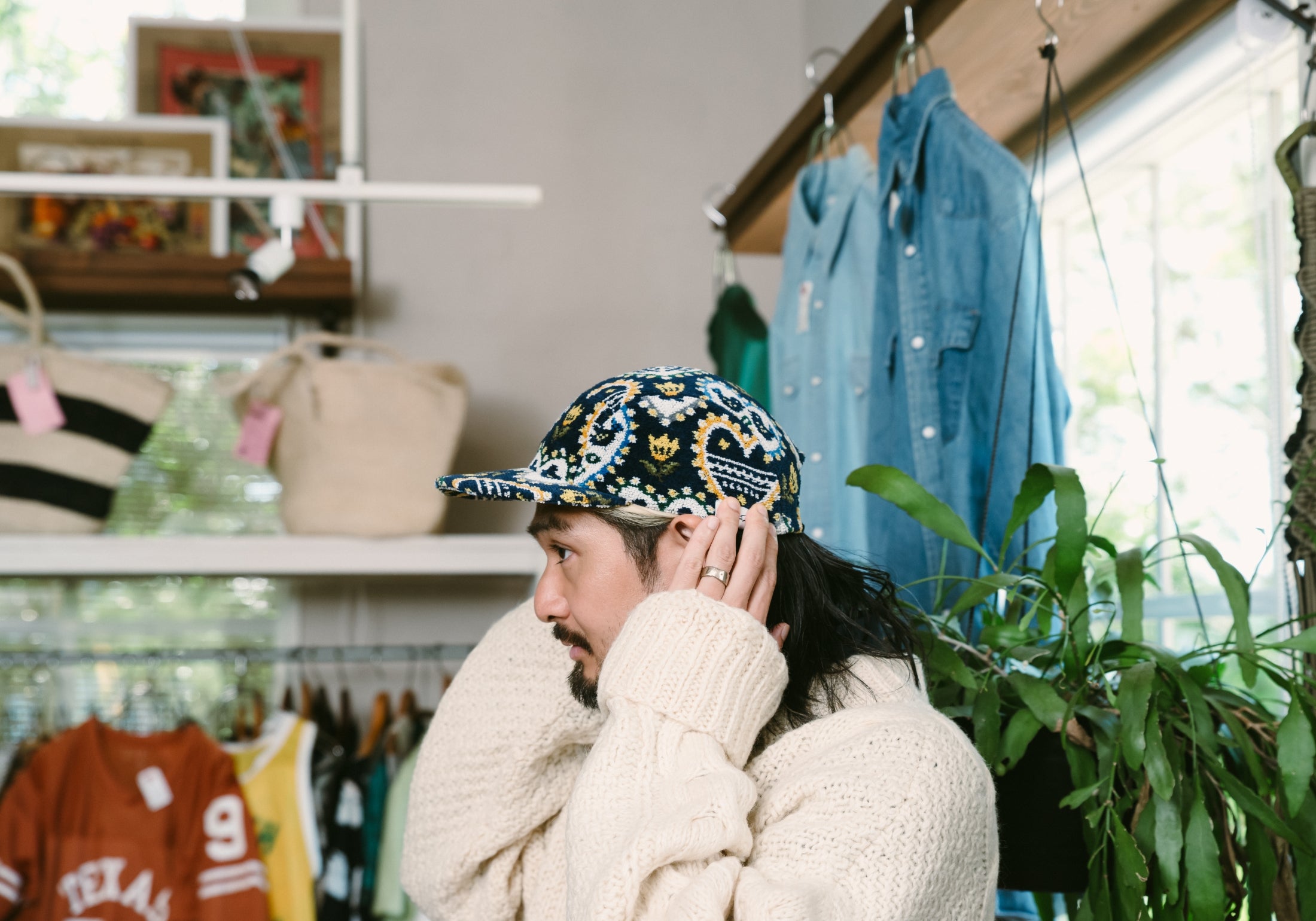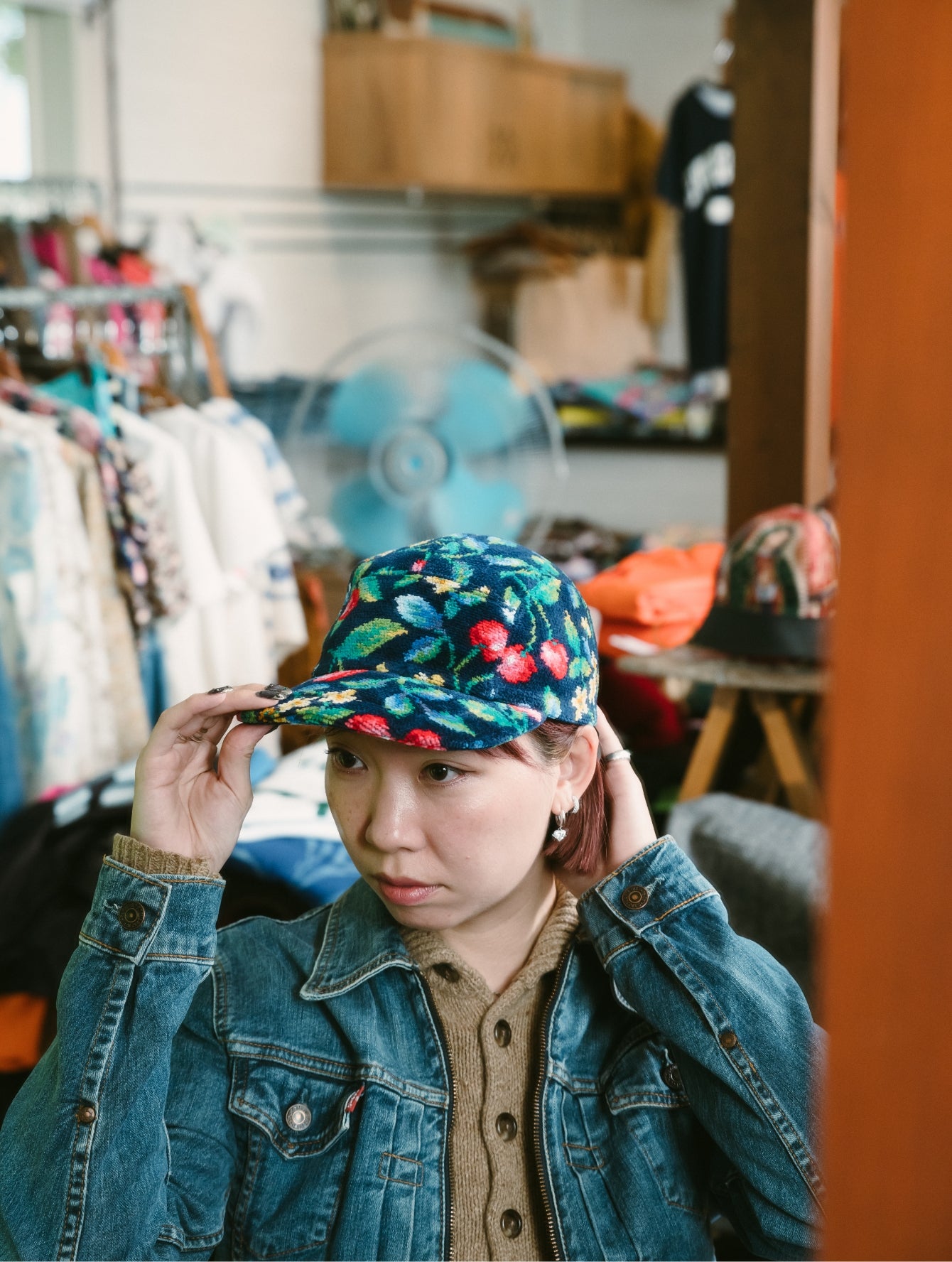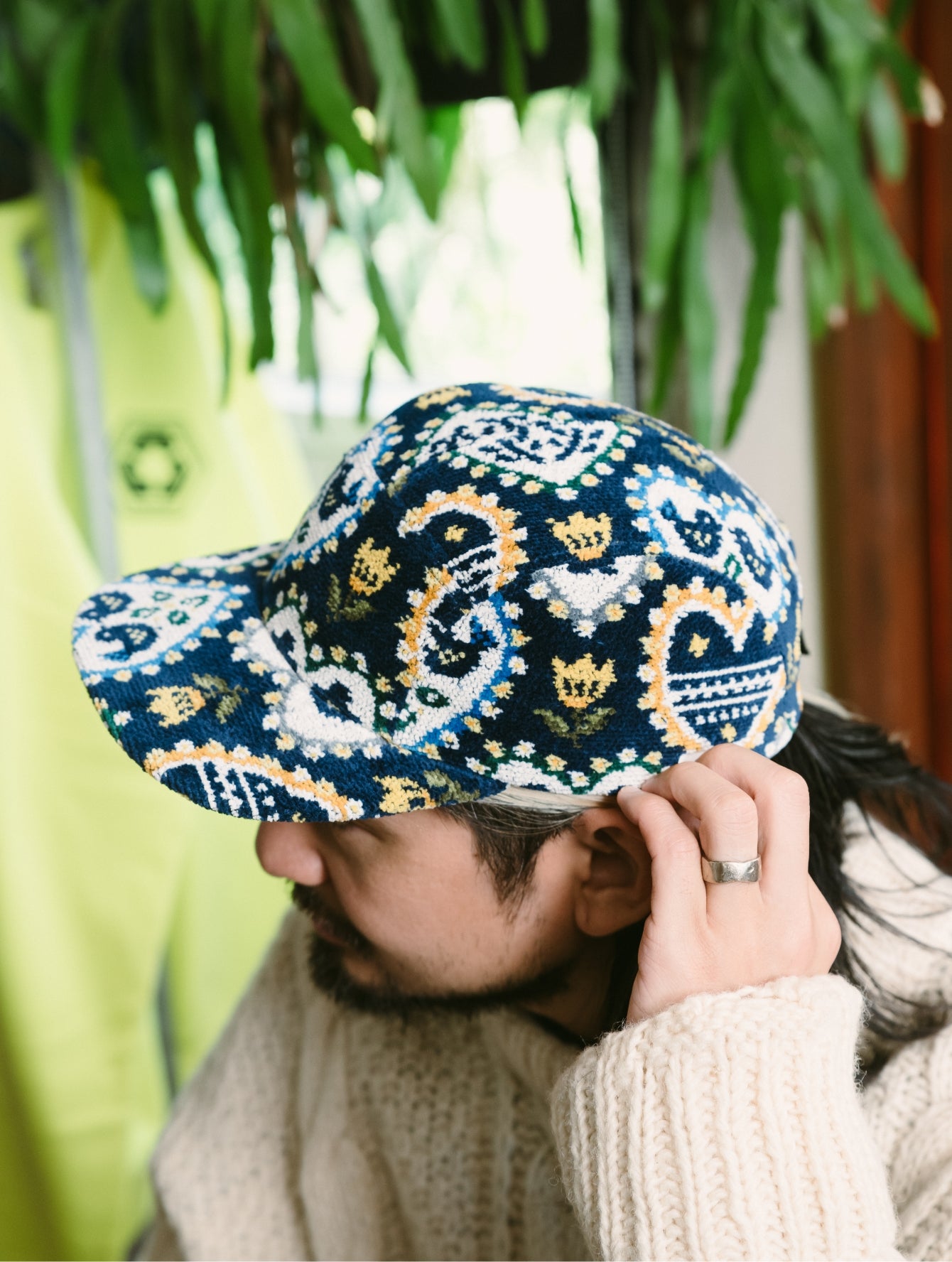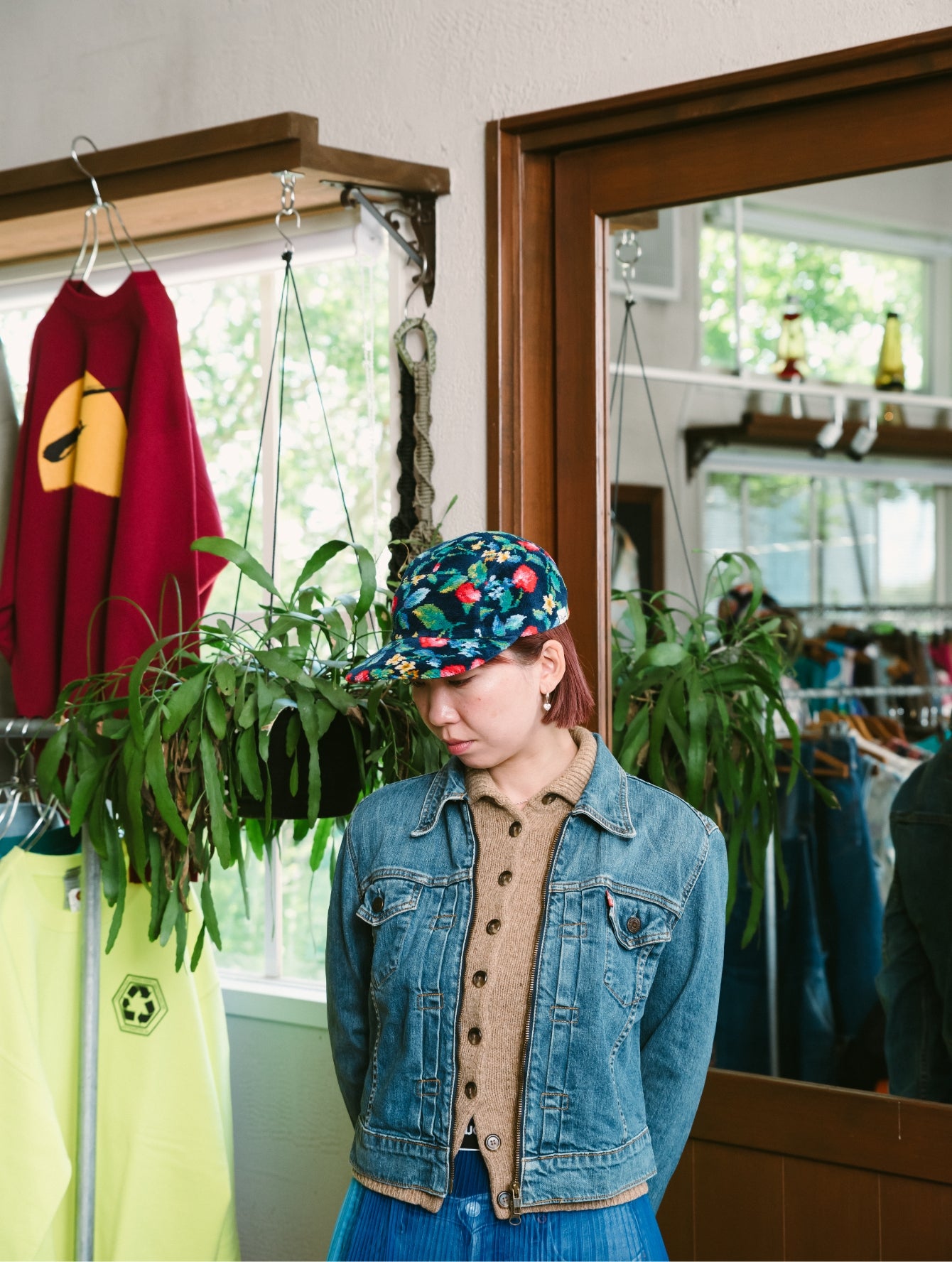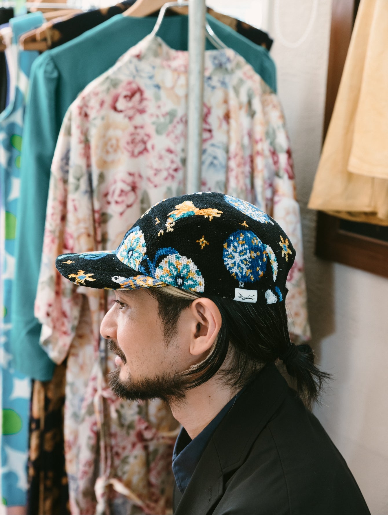 いつもはエレガントなFEILERですが、PASS THE BATONが企画したのはジェットキャップでした。仕立てを手掛けた古着屋さん「マグノリア」の古着と合わせてラフにかぶってみました。