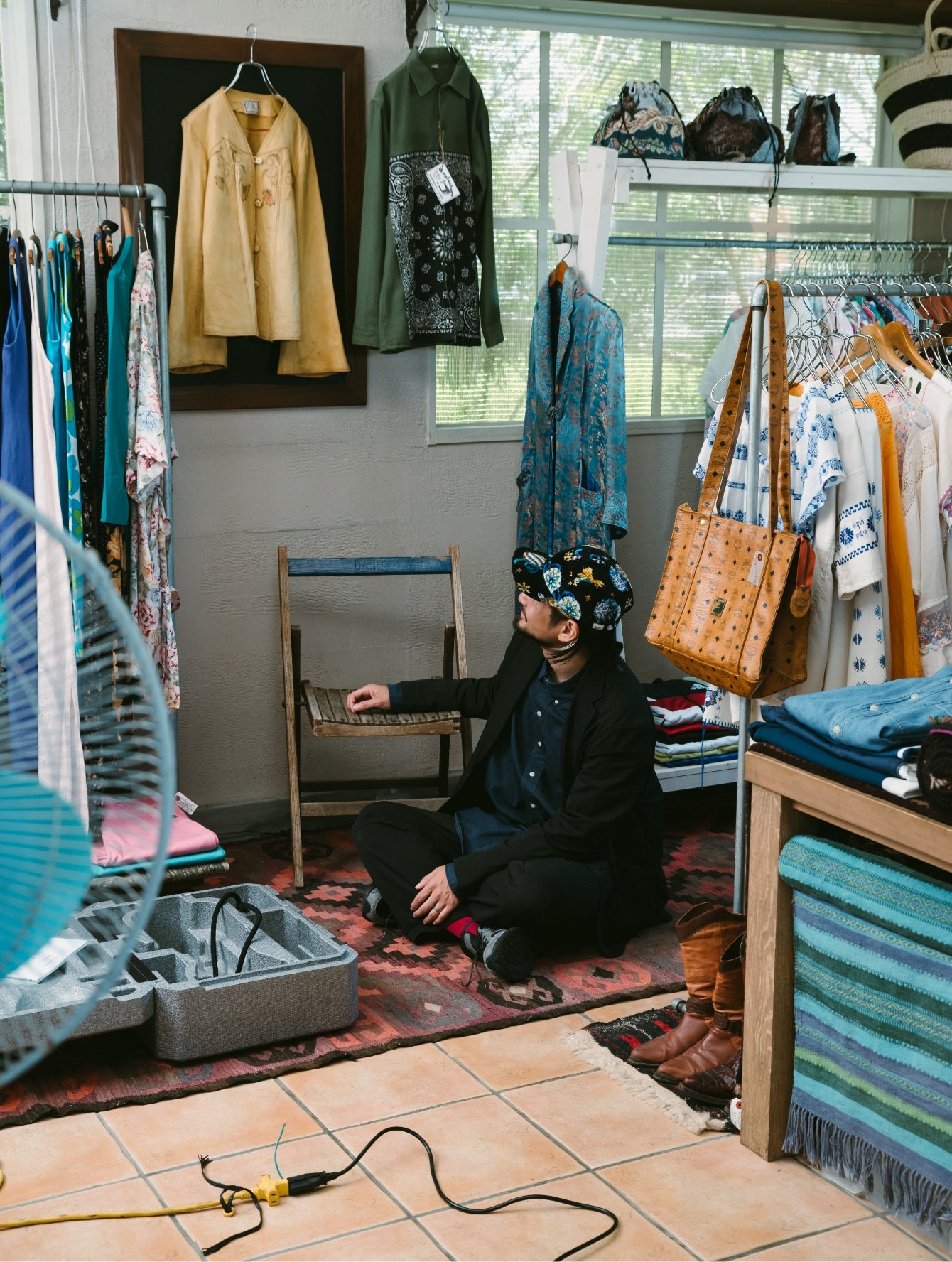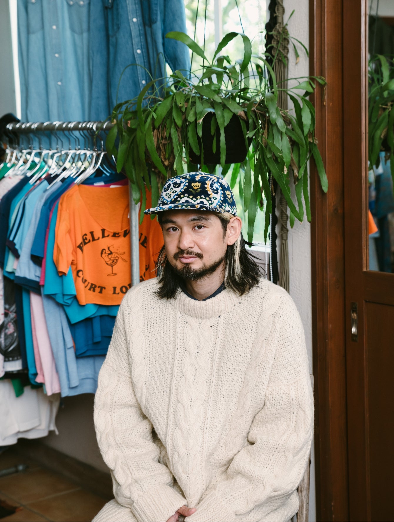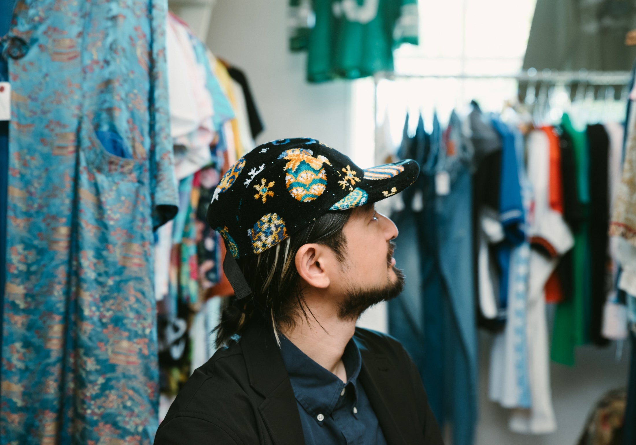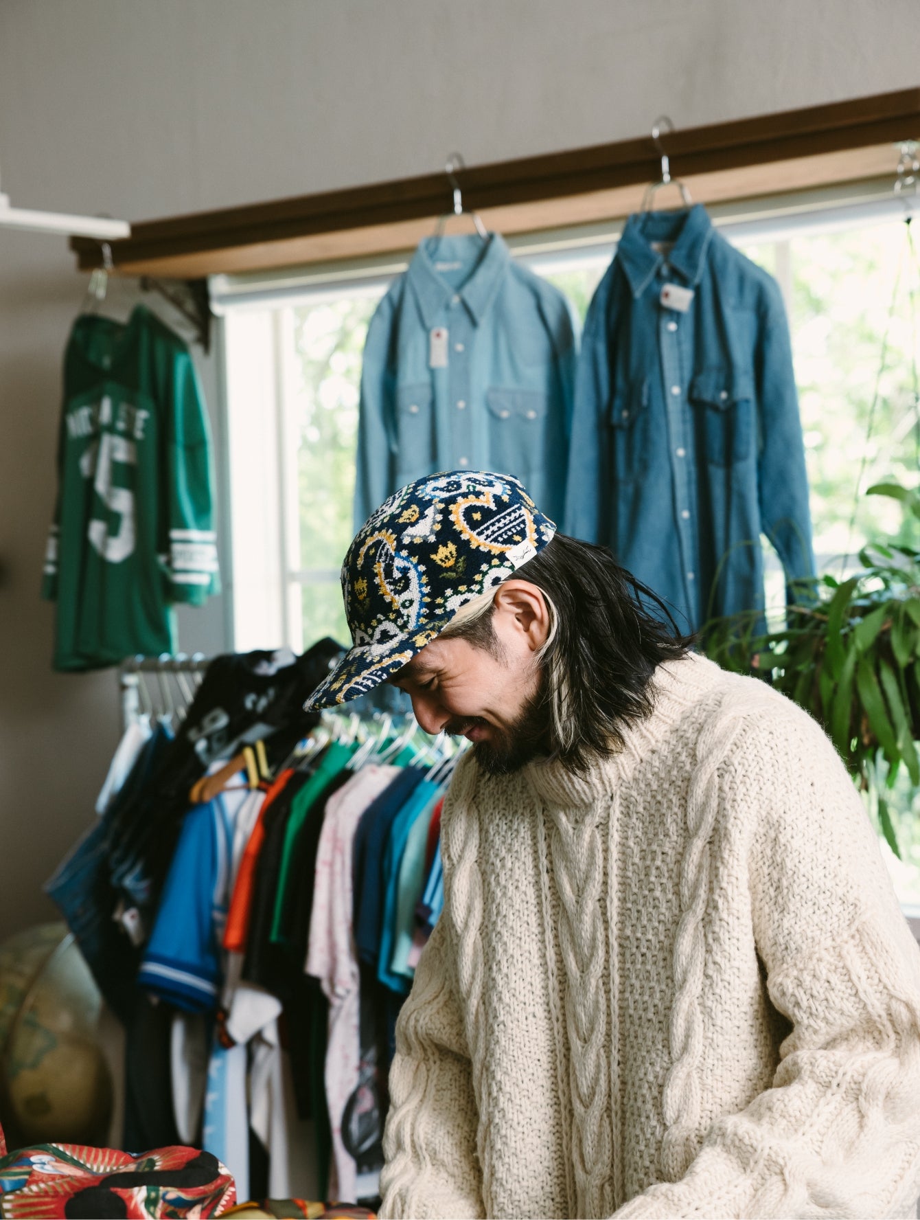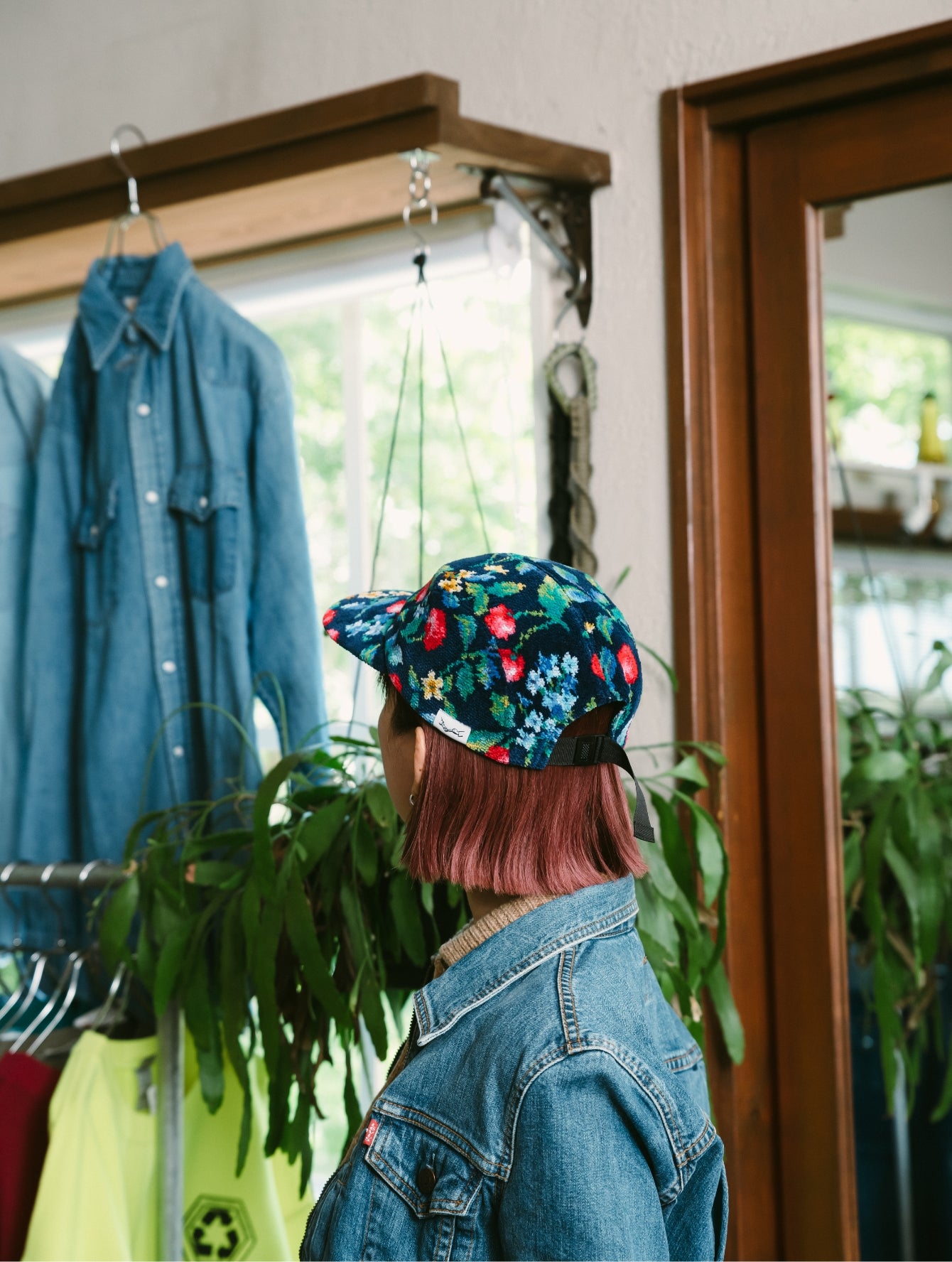いつもはエレガントなFEILERですが、PASS THE BATONが企画したのはジェットキャップでした。仕立てを手掛けた古着屋さん「マグノリア」の古着と合わせてラフにかぶってみました。