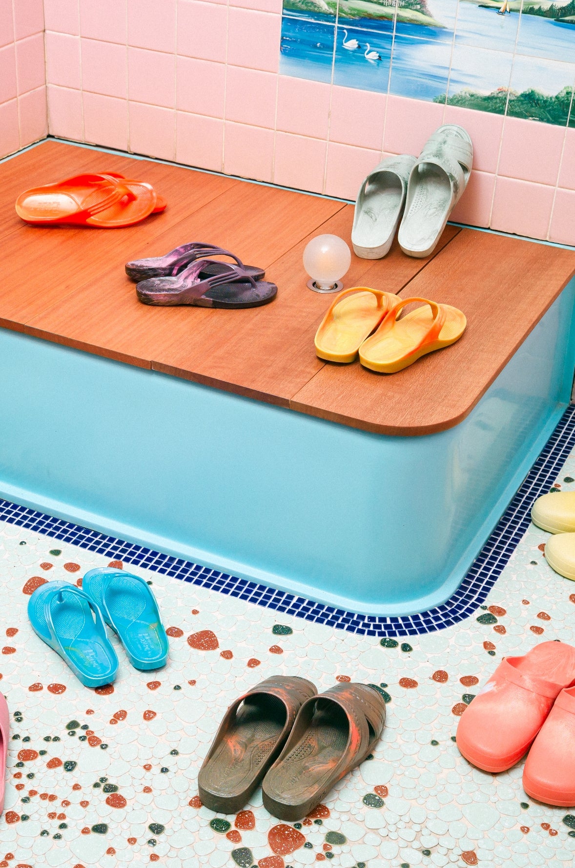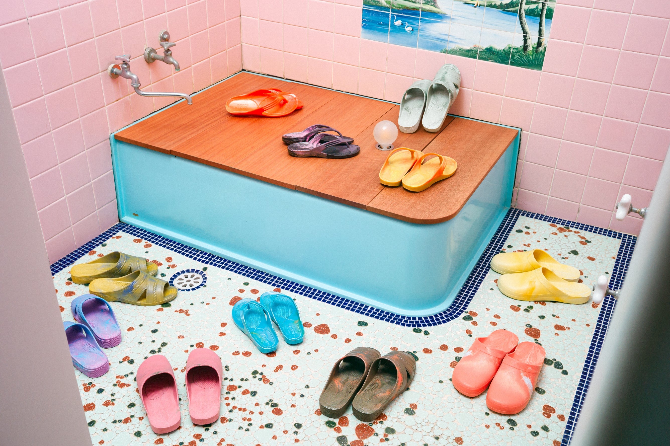 ご紹介するのはマーブル模様のサンダル。製造の過程で偶然生まれちゃうこのアイテムは、サンダルメーカー「丸中工業所」のもので、奈良の風変わりなサンダル屋さん「川東履物商店」はこれを”偶然サンダル”と名づけて販売しています。PASS THE BATONではかつては通常の流通から外れてしまっていたこのサンダルを、セレクトしてご紹介しています。