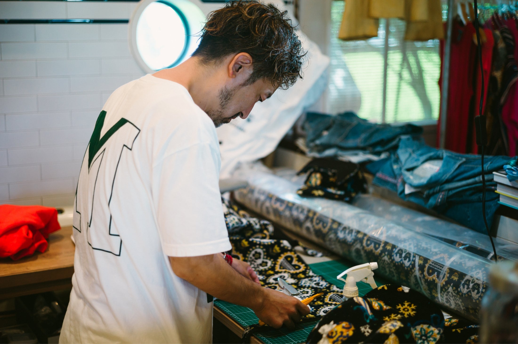 今回ご紹介するのは、まさに、そんな願いを叶えるアイテム。やむなく生まれてしまうフェイラーの残布で作ったジェットキャップです。PASS THE BATONのオリジナルアイテムとして、千葉の古着屋さん「マグノリア」に依頼し、ひとつひとつ手作りしています。言うなれば“食べるラー油”ならぬ「かぶるフェイラー」。この秋、登場です。