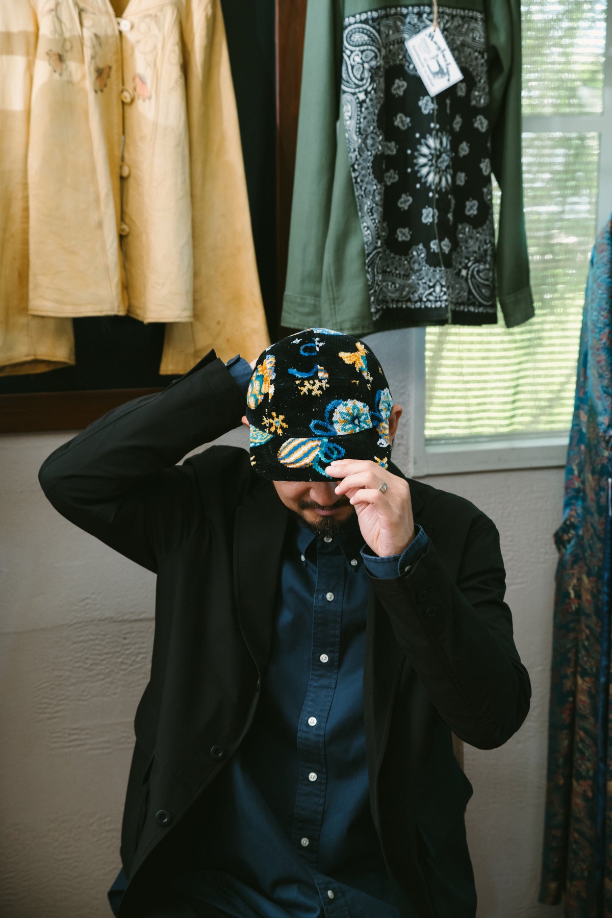 ブラックベースの生地にキラっとしたスリット糸が織り込まれているのがポイント。ジャケットスタイルなどに合わせてはずしアイテムとしてもおすすめです。どんなスタイルにも合わせやすいキャップです。