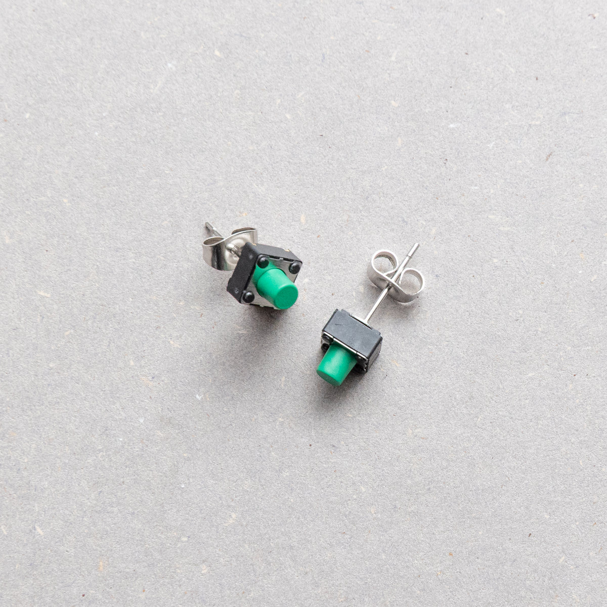 押せそうで押せないタクトスイッチで作られたピアス。ブラックのボディにグリーンのボタンが耳元でひそかに存在感を放ちます。身に着けた瞬間、あなたの気分もスイッチオン。