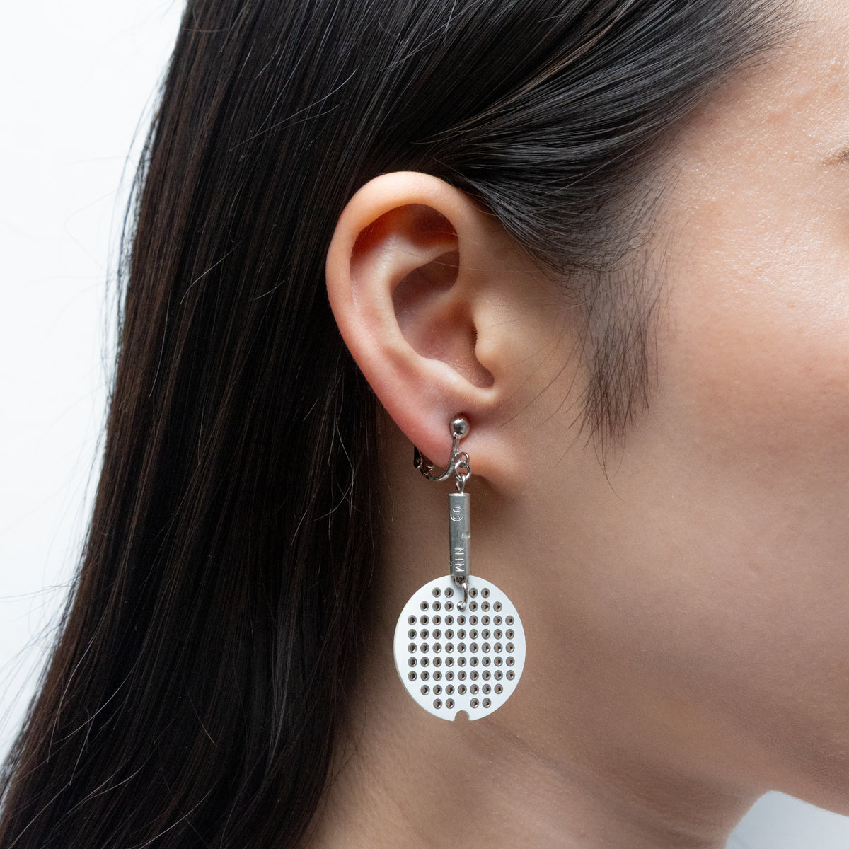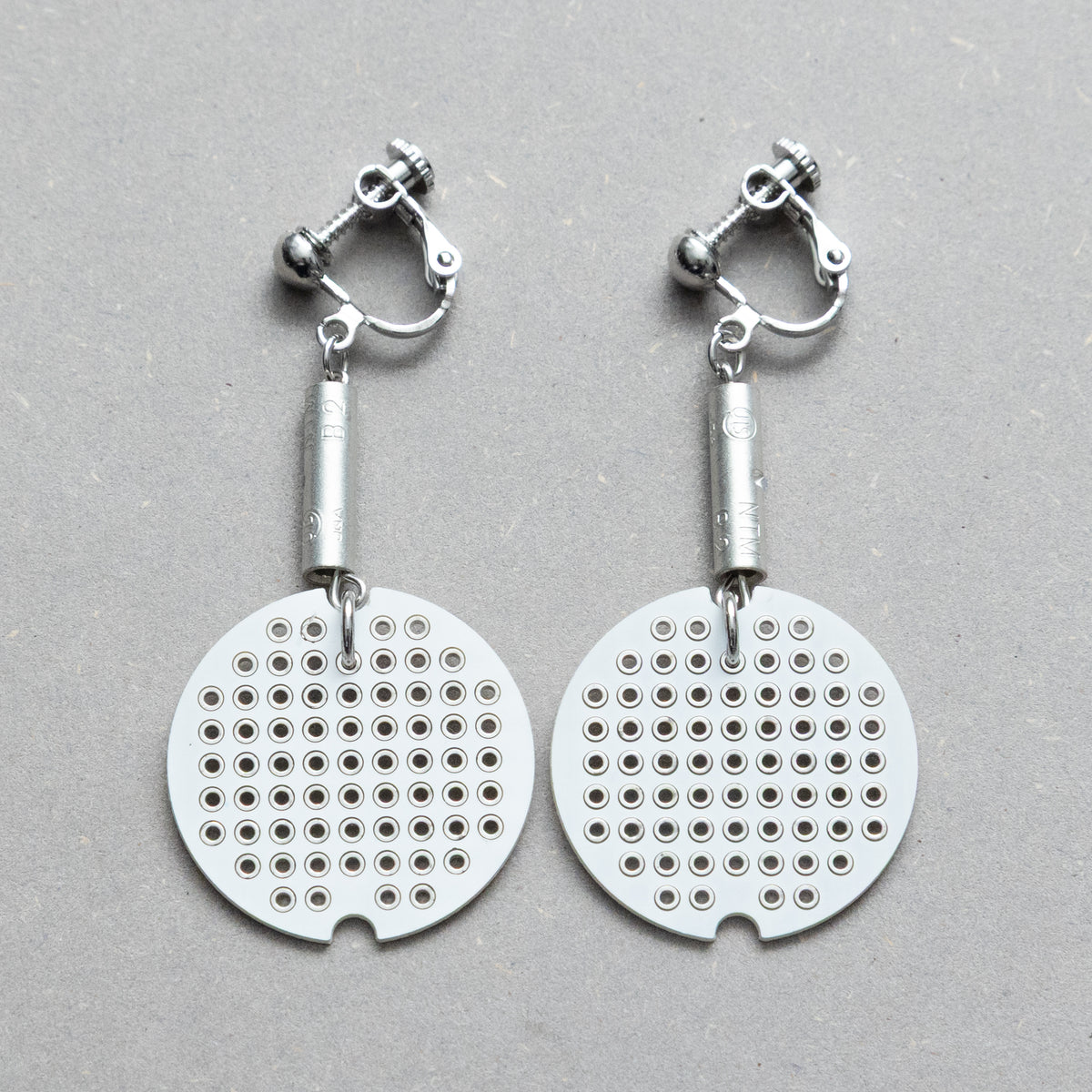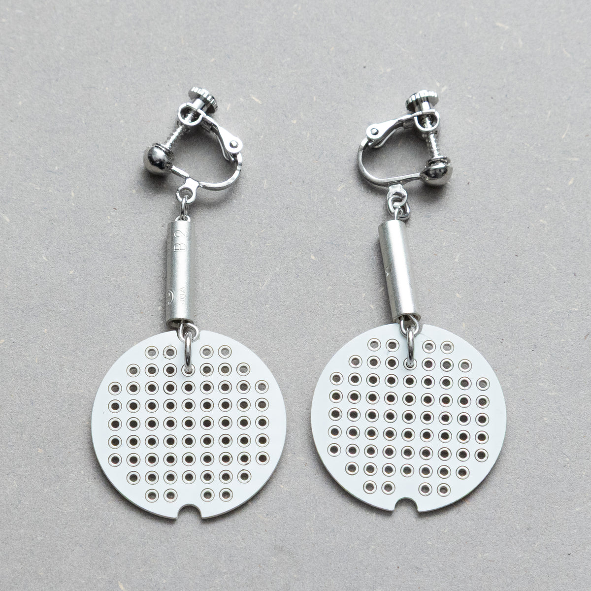 フューチャリスティックな円形の基板でできたイヤリングです。家電の中ではこんなクールでシャープな回路も活躍しているんですね。身につけると、ひらめきが訪れそうな予感です。