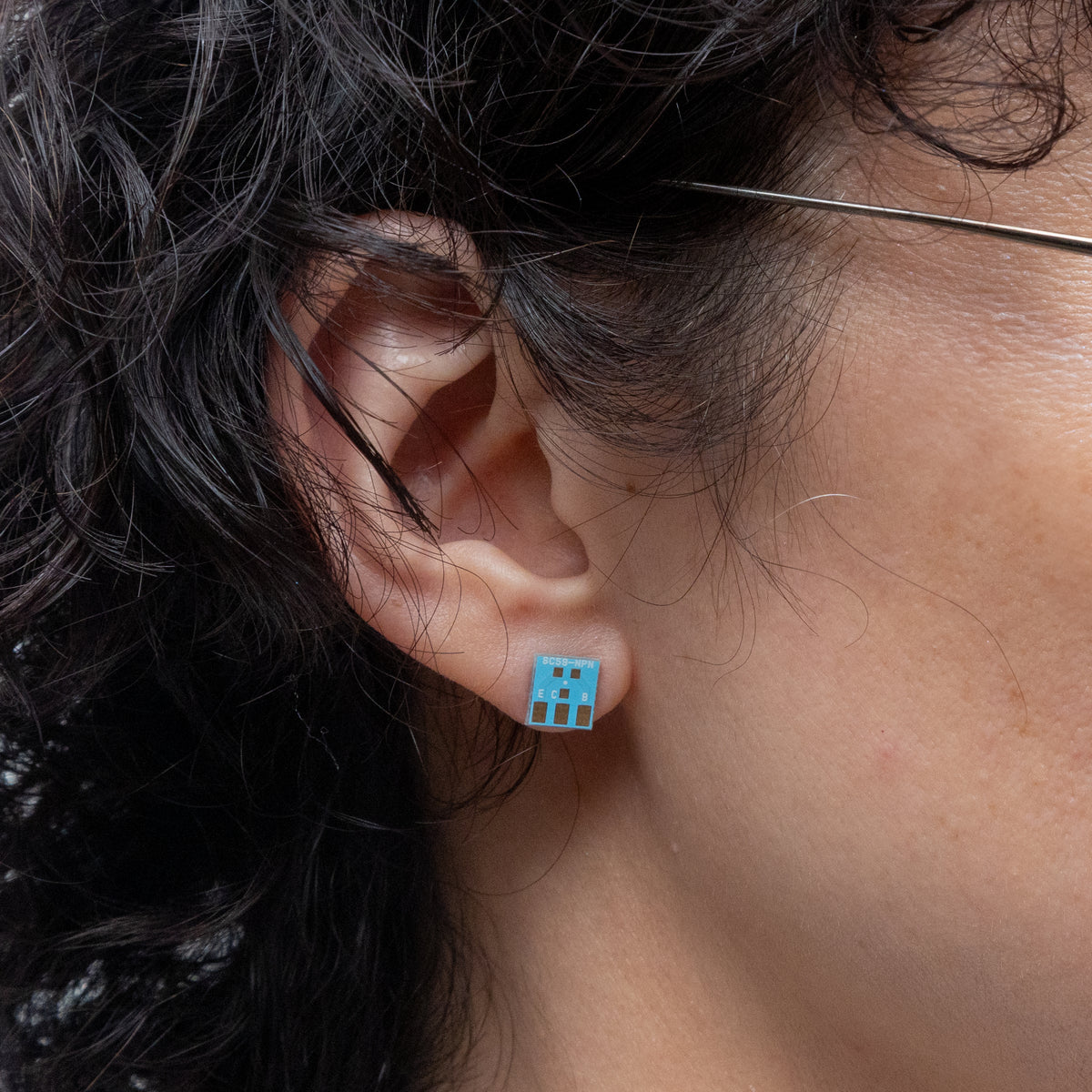 家電やパソコンの中でいつも働く小さな回路は、まさに知性の塊。澄んだライトブルーに、ひときわ映えるシルバーの基板がポップなアクセサリーに姿を変えました。身に着けると、不思議と知性を身にまとうことができます。