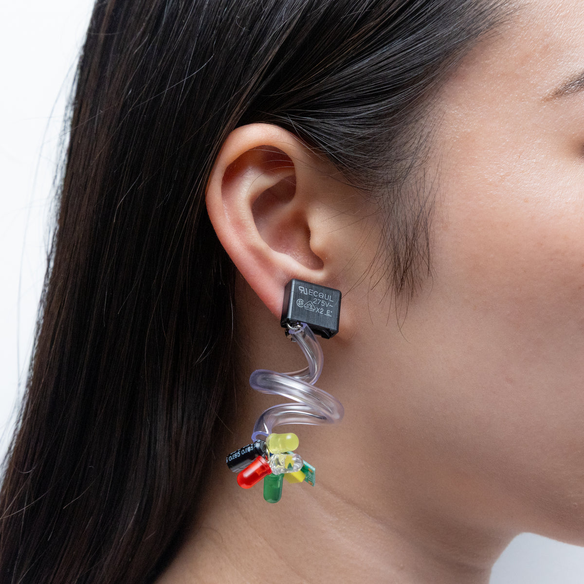 基板のグリーンやメタルの輝きは本来は無機質なのに、アクセサリーになると愛らしく感じられるから不思議です。すべてが手作業で仕立てられた、ほんの少し未来を感じるアクセサリーです。