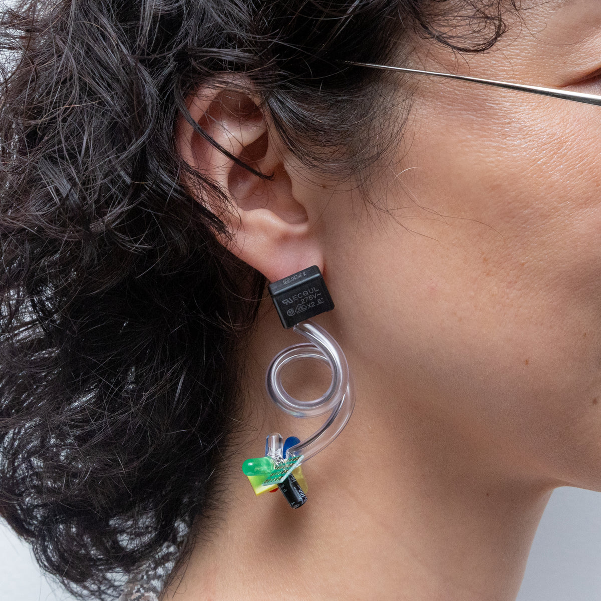基板のグリーンやメタルの輝きは本来は無機質なのに、アクセサリーになると愛らしく感じられるから不思議です。すべてが手作業で仕立てられた、ほんの少し未来を感じるアクセサリーです。