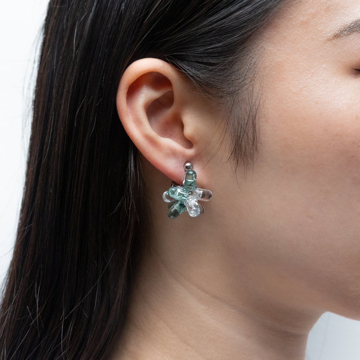 グリーンとクリアの電子部品を組み合わせた、花びらのようなイヤリングです。かつては家電やパソコンの中で働く、テクノロジーの先端だった部品たち。イヤリングに生まれ変わった今は、アクセサリーのフロントラインで活躍してくれます。