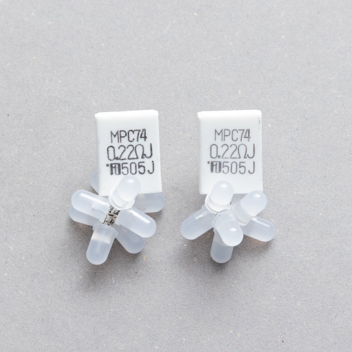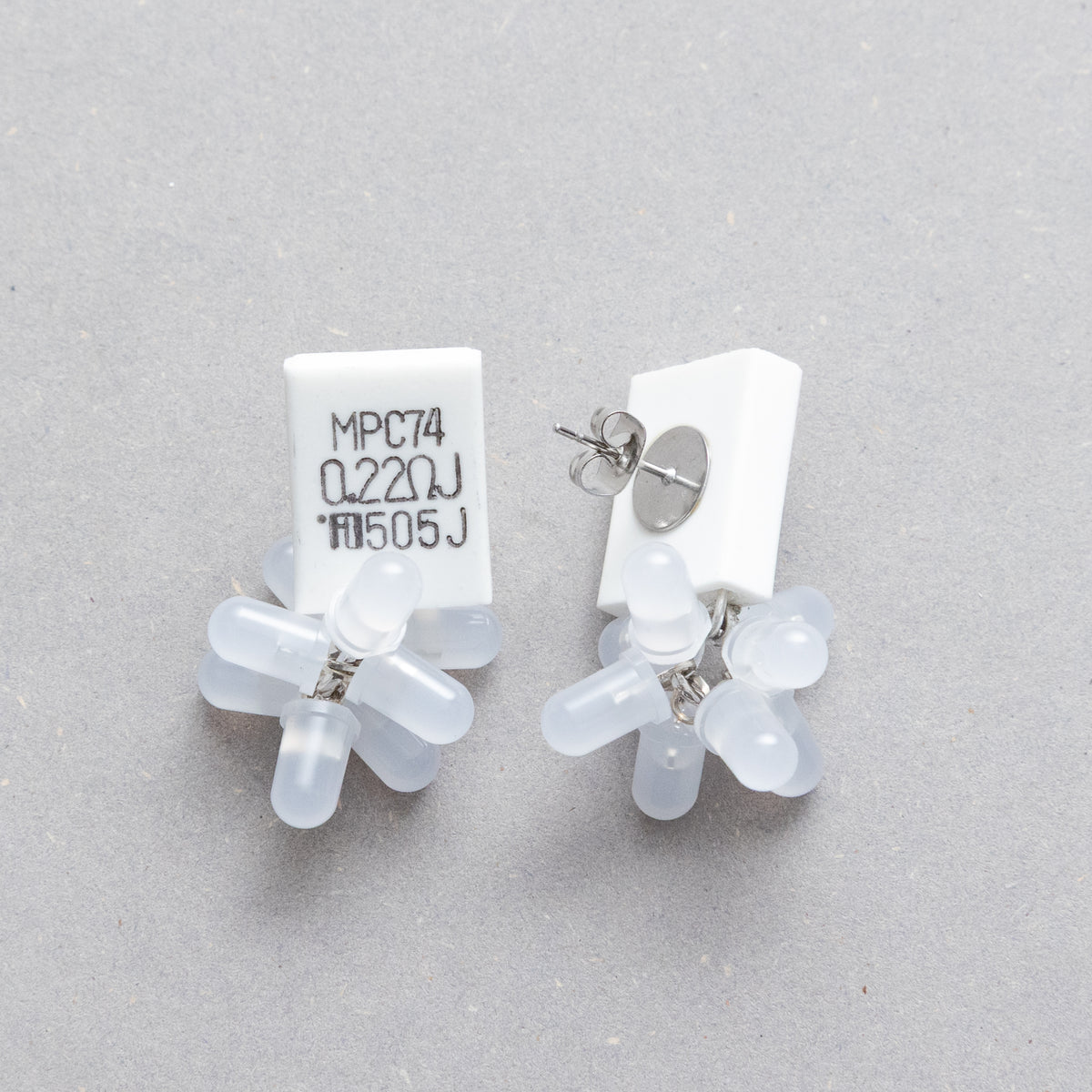 電子部品の透き通る白い花びらに、ホワイトのパーツを花瓶として添えました。かつては家電やパソコンの中で働く、テクノロジーの先端だった部品たち。ピアスに生まれ変わった今は、アクセサリーのフロントラインで活躍してくれます。