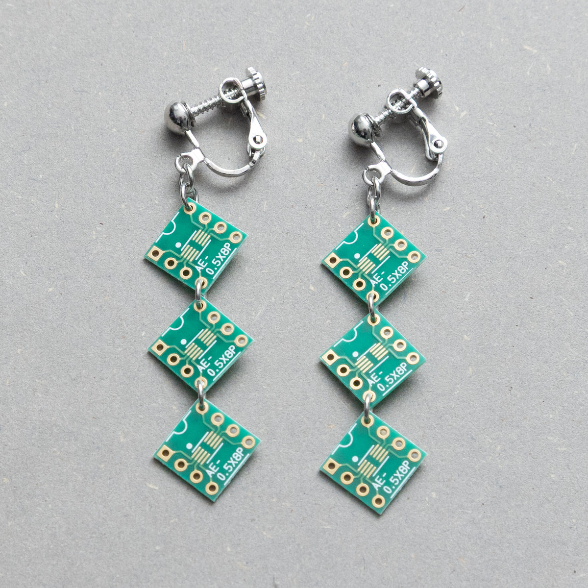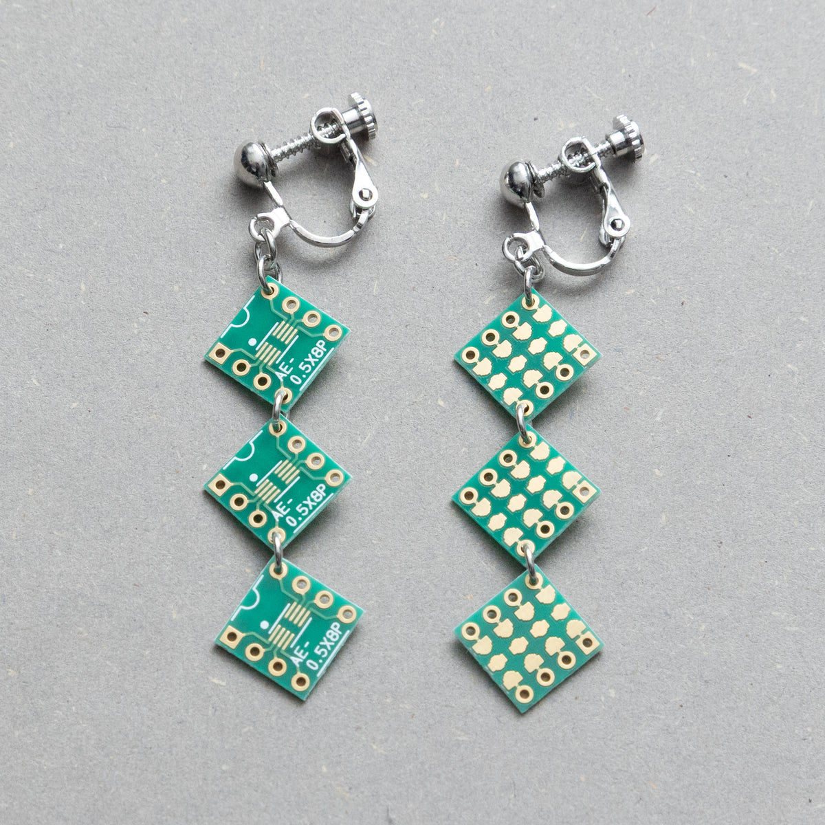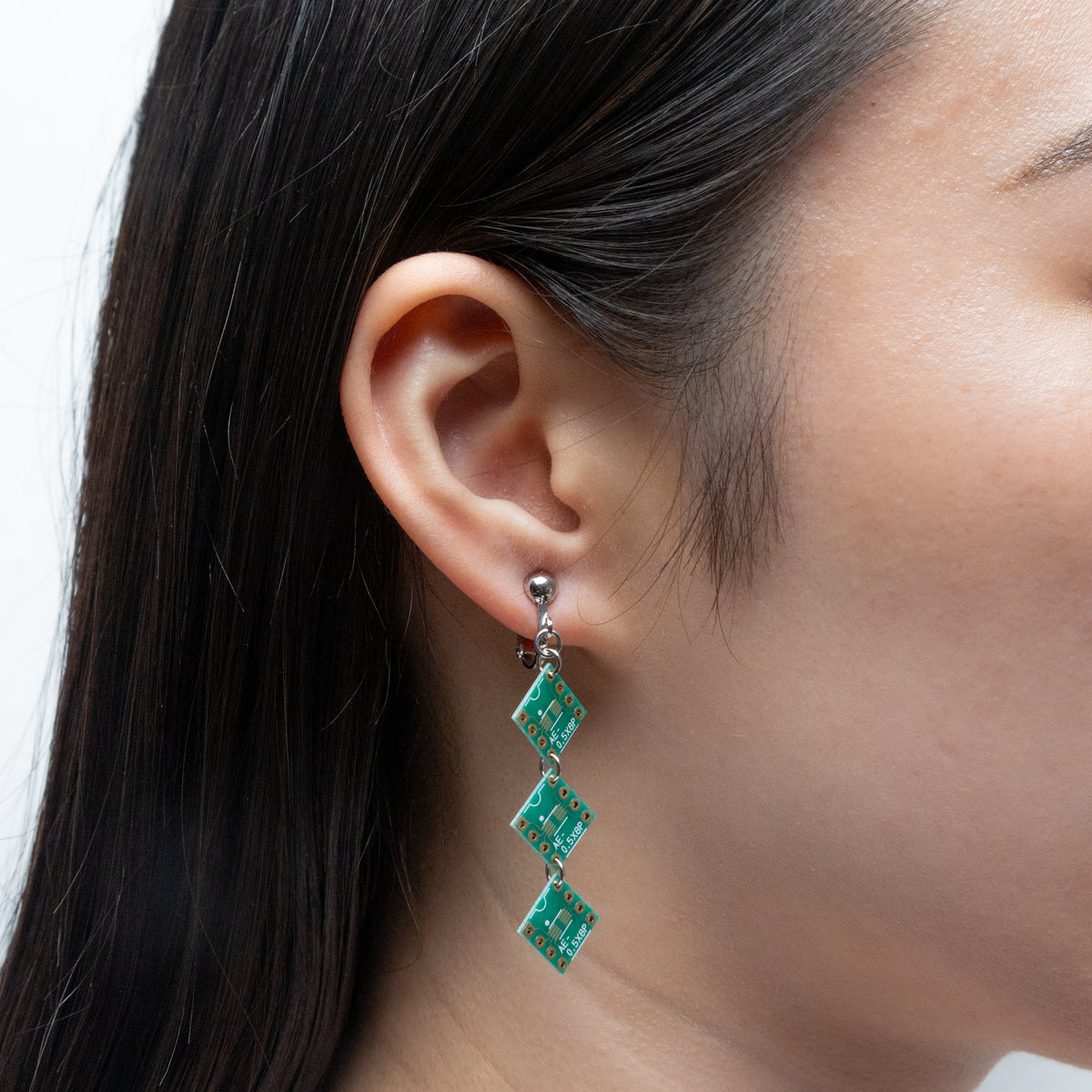 シルバーの輝きとグリーンの深みが映える基板を3つ連ねたイヤリング。