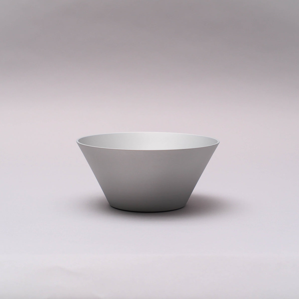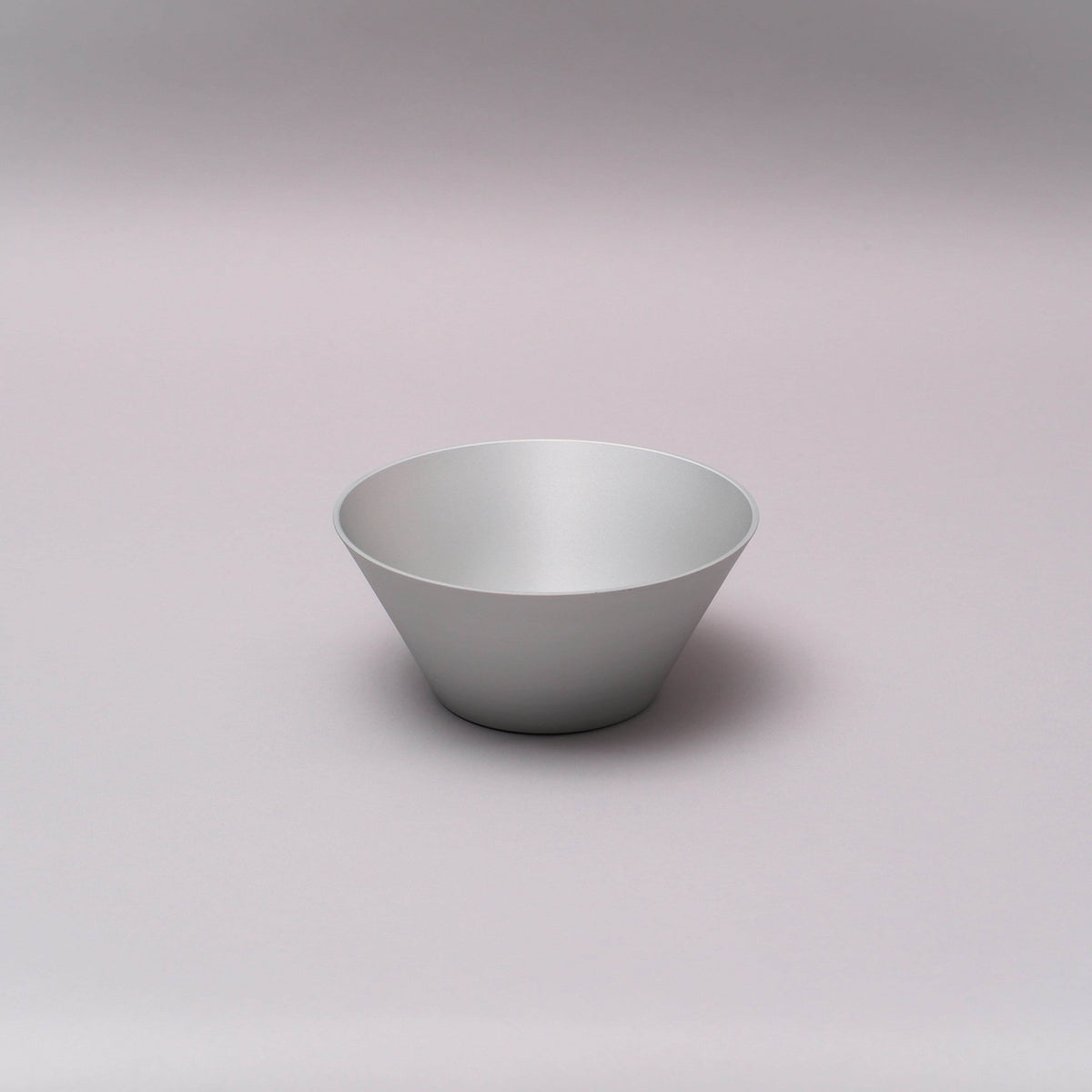 再生可能資源であるアルミを手仕事に近い技術を要する “へら絞り”で一枚ずつていねいに成形。 ブラスト加工で洗練された渋みのある質感を表し、 防食しながら表面の強度を高めるアルマイト加工で仕上げました。