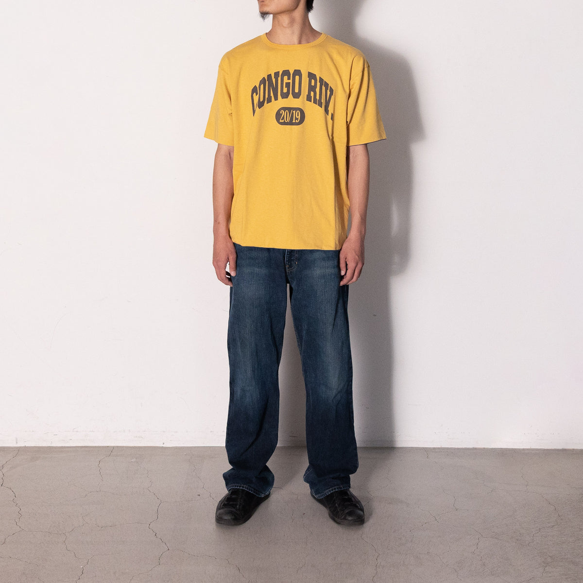 素材にはスビンコットンの中でもとりわけ希少性の高い「スビンゴールド」のムラ糸を採用。糸を紡ぐ際に短い繊維や不純物を取り除き、繊維を平行に揃えた「カード糸」と呼ばれるナチュラルな糸を使い、クラシカルな風合いに仕上げています。サイドポケット付きで、洗濯表示はその中に。表はカレッジテイストのプリント、裏は無地の仕様です。