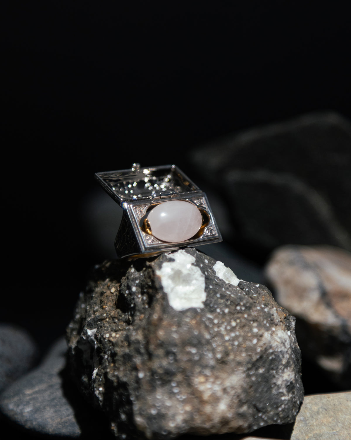 リングを取り出してそれぞれ別々に着用しても、宝箱を身に纏う感覚でボックスにリングを入れたまま着用しても。2WAYでお楽しみいただけます。